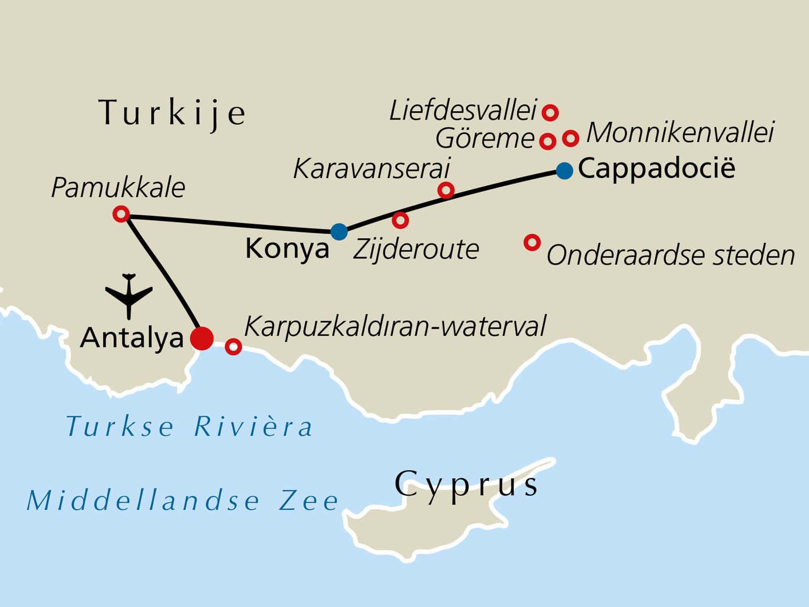 We vliegen comfortabel naar het betoverende Antalya, waar onze vriendelijke, Nederlandssprekende reisleider ons verwelkomt. Samen rijden we om te ontspannen en voor de eerste nacht naar ons comfortabele sterrenhotel. Onze weg voert ons op de 2e dag door het imposante Taurusgebergte naar Konya. Het vroegere Ikonium werd onder de apostel Paulus en de heilige Barnabas een van de grootste christelijke gemeenten. De voormalige Seltsjoekse hoofdstad is tegenwoordig vanwege haar christelijke en islamitische oorsprong een aantrekkingspunt voor mensen uit de hele wereld. We bezoeken het klooster van de dansende Derwisjen (toegang inbegrepen). De dans van de monniken is uitgeroepen tot immaterieel UNESCO werelderfgoed van de mensheid. De volgende drie nachten verblijven we in ons moderne sterrenhotel in Cappadocië.